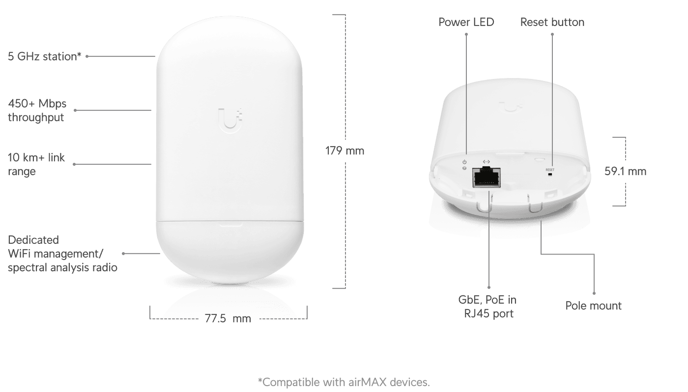 Network: 1x Gigabit Ethernet port, airOS 8 firmware, UNMS app compatible